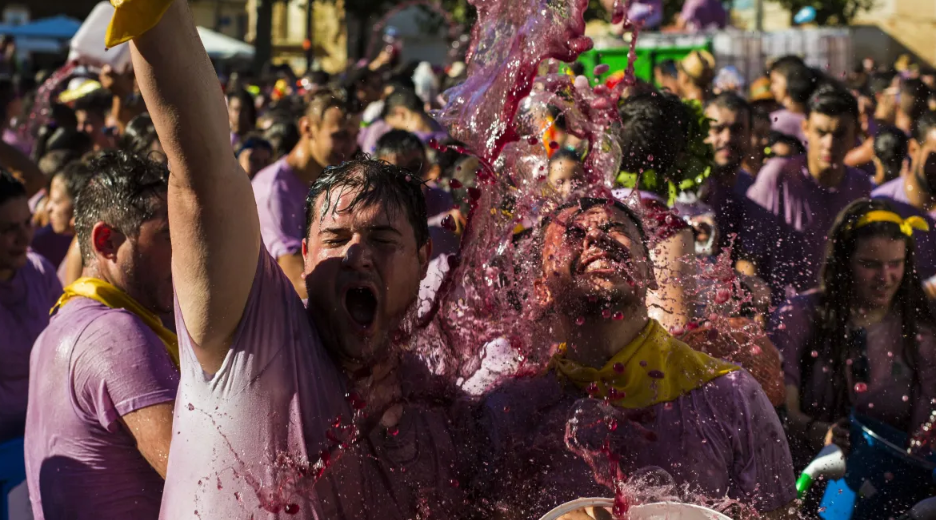 O que começou como uma procissão religiosa até a Ermida de San Felices, um santuário histórico no alto de uma colina, evoluiu para uma vibrante festa cultural: milhares de pessoas se ensopam de vinho tinto, usando pistolas d’água, baldes e garrafas
